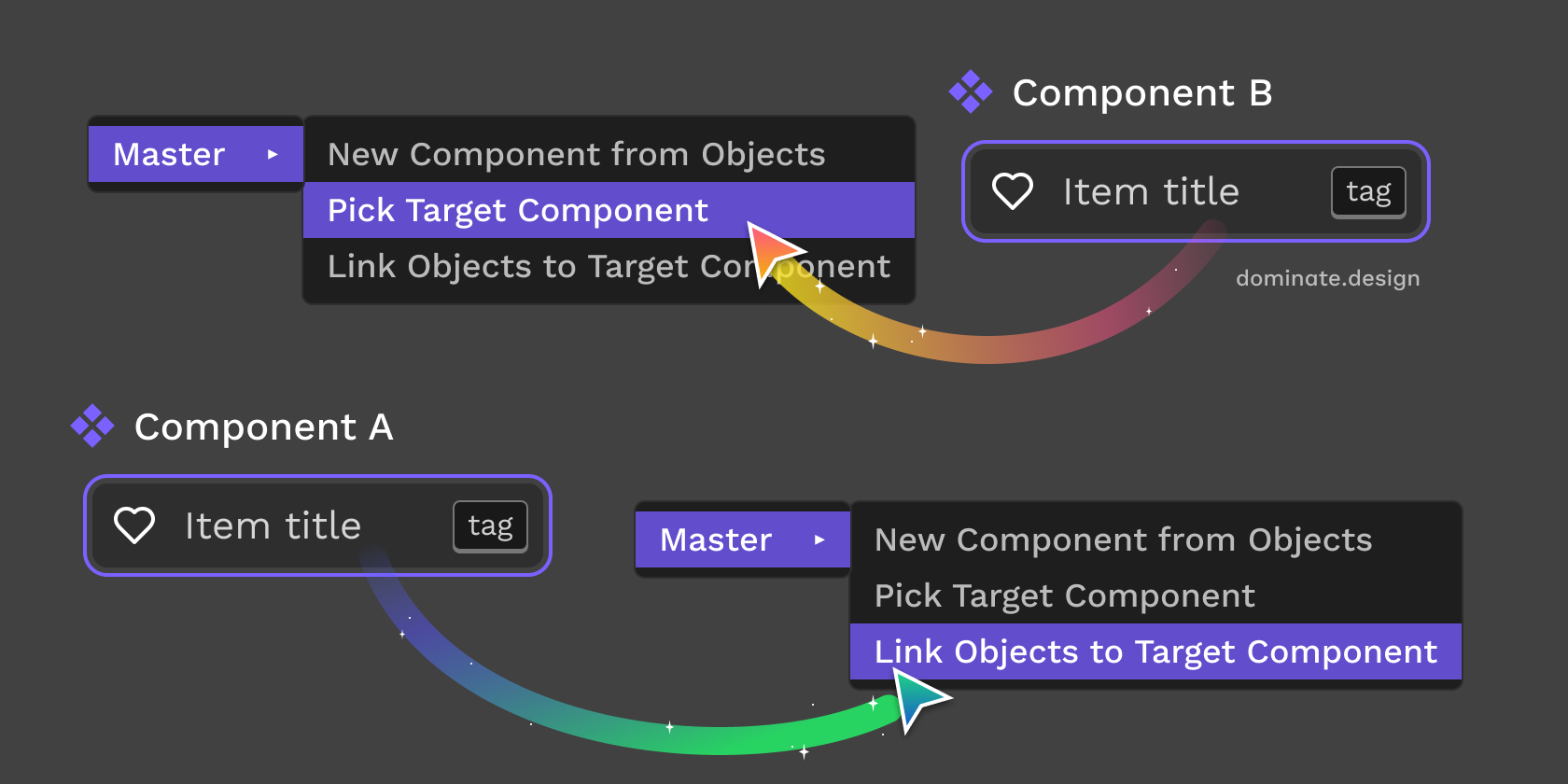 - Deselect everything (press Esc) and run Master → Link Objects to Target Component again. This will find all instances of the component you just Linked (Component A) in the current file and link them in bulk to the component you Picked (Component B).